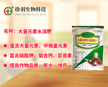 大量元素水溶肥料為經(jīng)水溶解或稀釋,用于灌溉施肥、葉面施肥、無(wú)土栽培、浸種蘸根等用途的液體或固體產(chǎn)品,可以葉面施肥、浸種蘸根、灌溉施肥,灌溉包括噴灌、滴灌等方式進(jìn)行灌溉時(shí)施肥,既節(jié)約用水,又節(jié)約施肥,而且還植物吸收快,大量元素水溶肥是一種可以完全溶于水的多元復(fù)合肥料,它能迅速地溶解于水中,更容易被作物吸收,而且其吸收利用率相對(duì)較高,我們看一下珍羽生物的大量水溶肥。